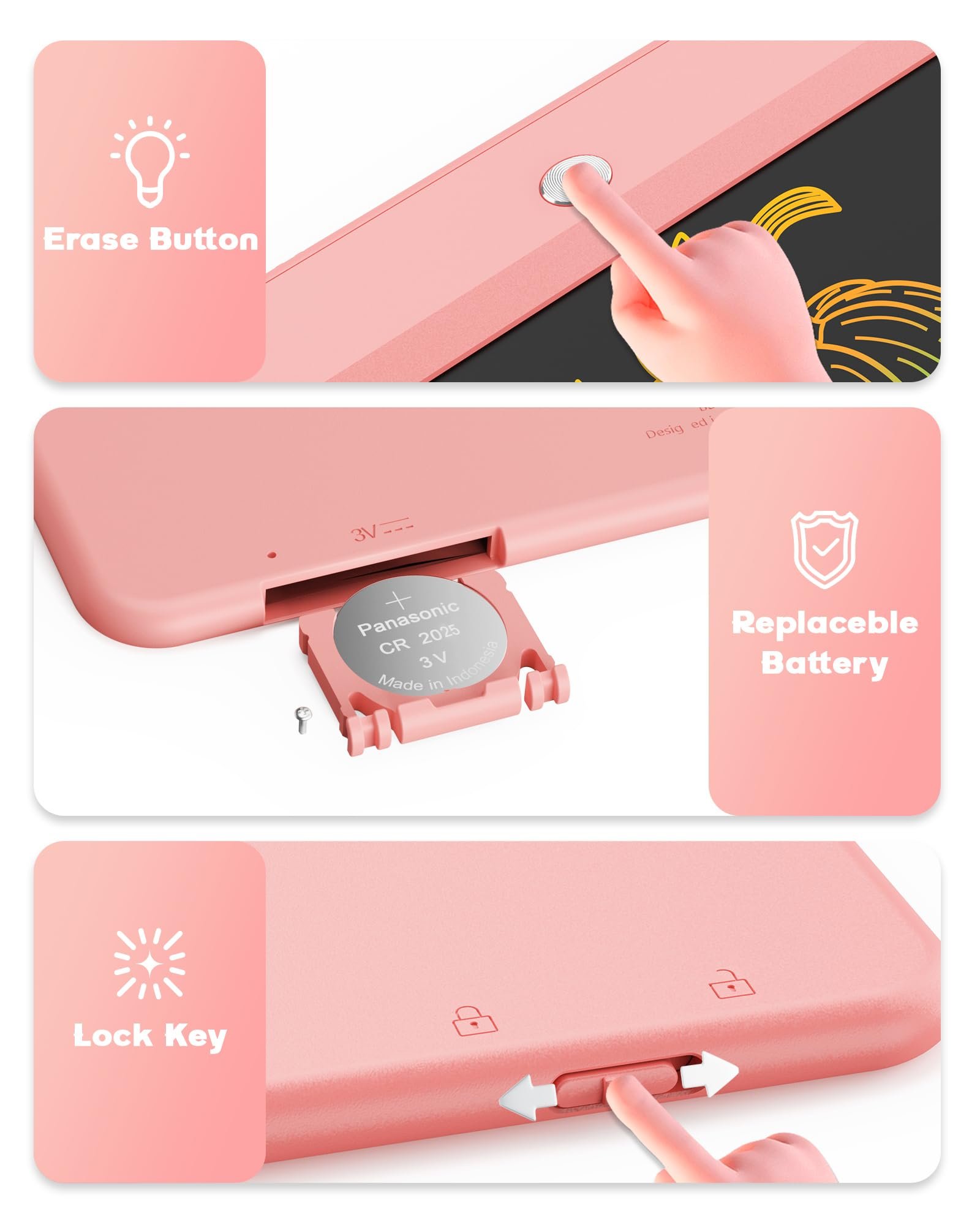 - EDUCATIONAL AND LEARNING TOY FOR KIDS: ♥ The battery door on the back of the drawing table is fixed by a screw, which is safer for children.LCD writing tablet for kids can be used as a doodle board, drawing tablet, writing board, doodle pad, kid’s drawing pad, toddler drawing board, graphic tablet, educational toys, toddler girl toys, baby girl gifts.